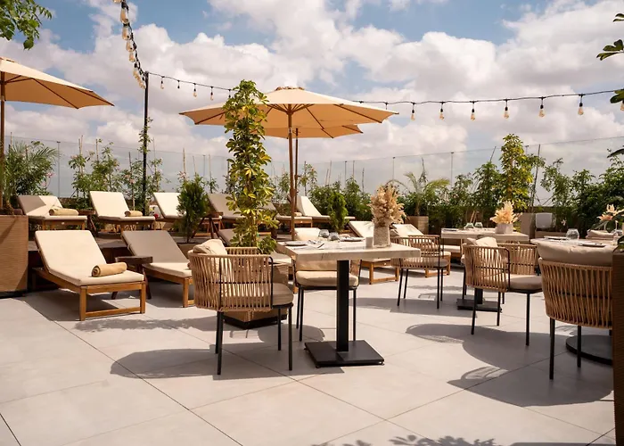 Het hotel is gesitueerd niet ver van tuinen en palmbomen in Marrakesh.